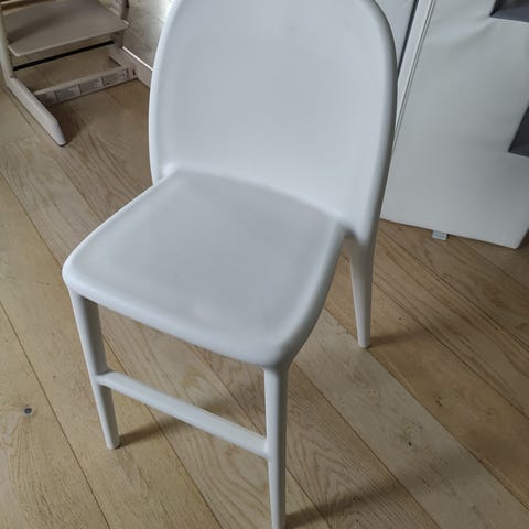 IKEA børnestol i hvid plast med enkel, glat overflade. Har fodstøtte foran og er let at tørre af.