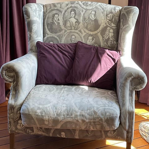 Meget velholdt stol i rosa, blå og svagt grønne farver. Virkelig fin og enkel. Skal hentes i Rødovre