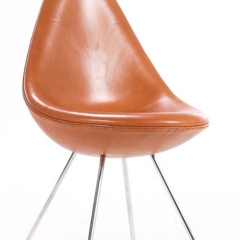 Arne Jacobsen. 'Dråben'. To spisestole med brown label, med grå læder, ben i forkromet stål. Formgivet i 1958 til SAS Hotel Royal i København. Fremstillet hos Fritz Hansen i 2015, mærke herfra. model 3110.