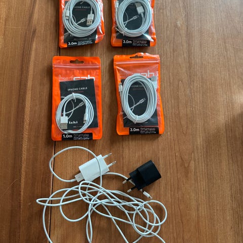 Flere Apple opladere og kabler sælges samlet, både hvide og sorte. Der er både vægopladere og løse kabler i forskellige længder.