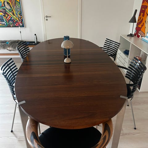 Snedkergaarden, bord, Afrikansk valnød, med 2 indlægsplader a 47 cm hver. Bord måler 105 x180 cm, højde 72,5 cm. Meget velholdt, er som nyt.