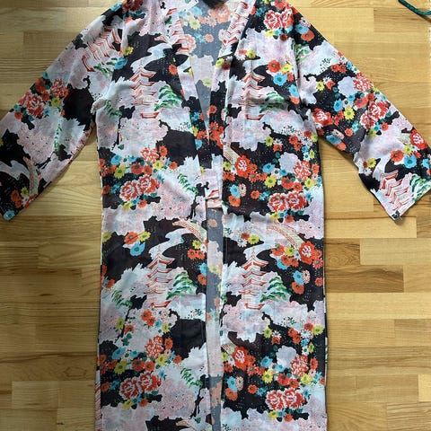 Multifarvet kimono/let jakke fra i viskose, one size. Åben model med 3/4-ærmer og print med grene og store blomster foran og bagpå.