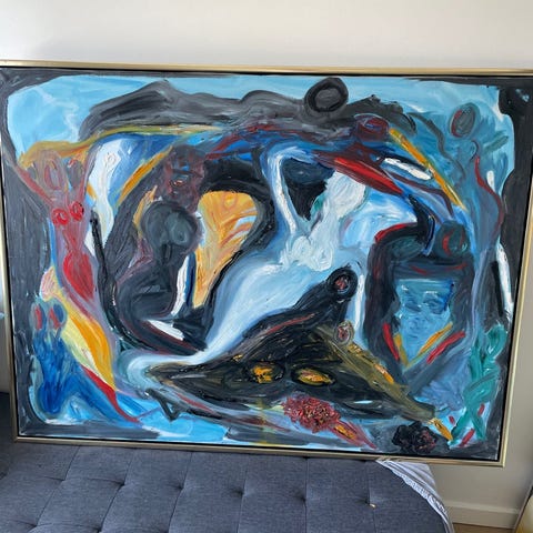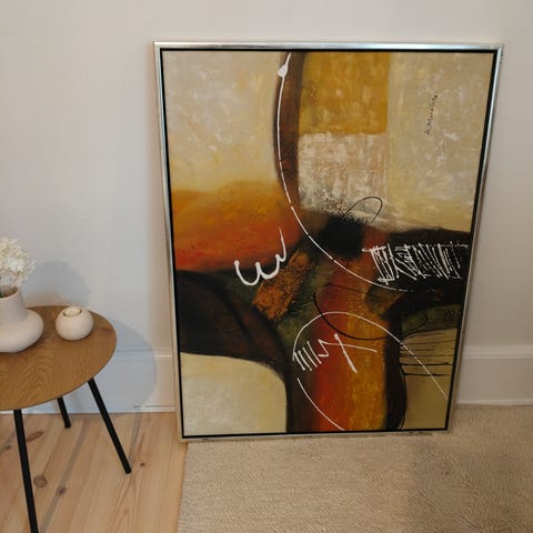 And, ande maleri i gule, brune og orange nuancer med organiske former. Sidder i en guldfarvet træramme og er klar til at hænge op på væggen.