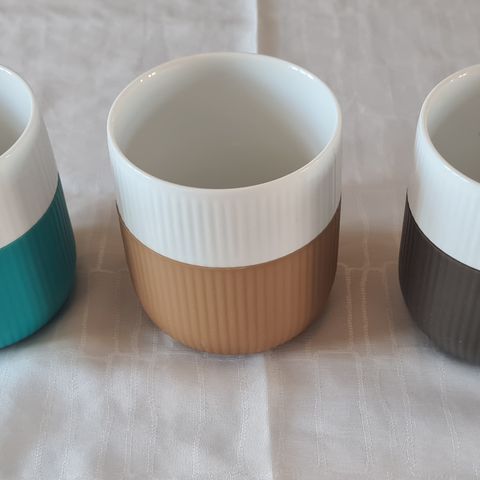 Royal Copenhagen krus i porcelæn i flere farver. Krusene har hvid overdel og farvet underdel i forskellige nuancer. Velegnet til servering af varme og kolde drikke i køkken eller stue. Kan bruges enkeltvis eller som sæt afhængigt af behov.