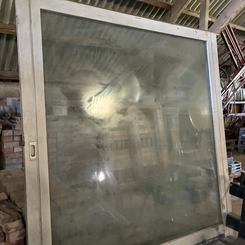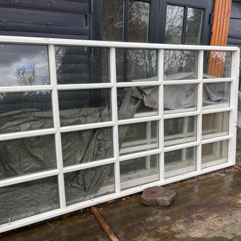 Vinduespartier med grøn ramme af træ. Rimelig stand - har siddet i en udestue. I alt 3 stk. med 3 aflange ruder i hver.