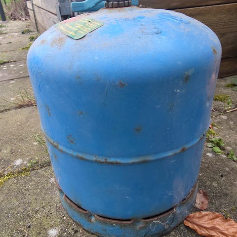 HOT WOK gasblus med kraftig brænder og tre justerbare haner foran. Der følger gasslange og regulator med på billederne, så køber kan se tilslutningen.