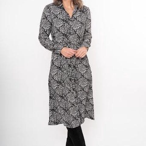 Lovechild hverdagskjole i str S med sort/hvidt "Lovechild" allover mønster. Langærmet model med bælte i taljen og 2 skjulte lommer i siderne. Lang lynlås i siden.