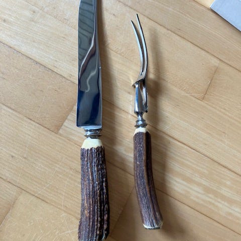 udskåret træ-forskærersæt med indeholdende både kniv og gaffel, hvor skeden og håndtaget er udformet som en fisk. Vintagesættet stammer fra Indien.