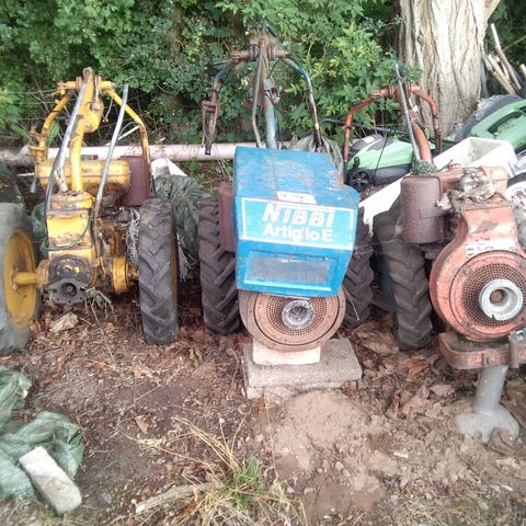 Havefræser / havekultivator med blå skærm og kraftige hjul. Har styr med håndtag og motor foran, klar til at blive sat i gang igen efter dit behov.