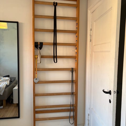 Skoleribbe med patina i massivt træ til montering på væg. Fastgøres med beslag i siderne og har mange ribber hele vejen op.