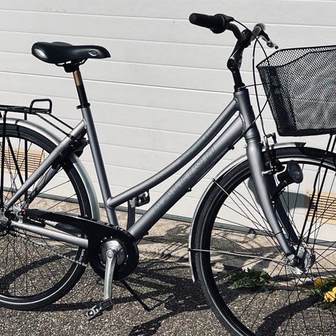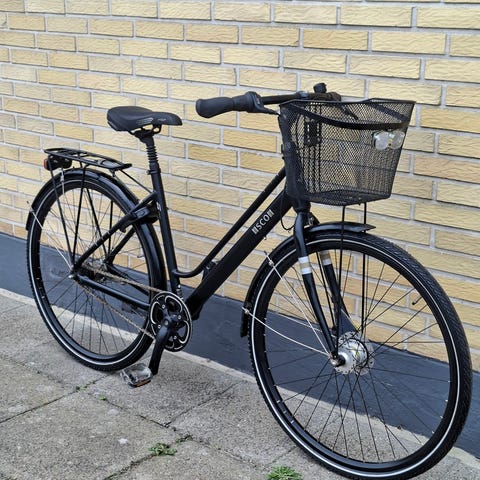 Pæn Dame/pigecykel med 7 indvendig gear og med håndbremse foran, fodbremse bag. Lås med 2 nøgler. Ny batterilygte bag, ny nav Dynamolygte foran, nye håndtag, ny sadel. Ny gearskifter +kabel og wire. Der er lås i forgaffelen til stabilitet når der er vare i frontkurv. Stel str 50 passer personer fra 165 cm til 175 cm. Hjul str 28. Stel nr WAV42974B. Alt er smurt og gennemgået for fejl og mangler. Kører godt. Prisen er fast pga nye ting på cyklen.