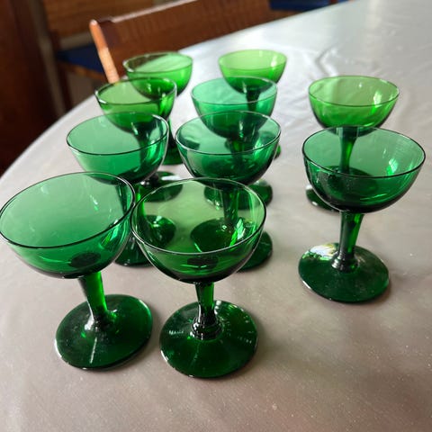 Grønt hvidvinsglas i modellen “ Mandalay”, designet af Per Lütken for Holmegaard i 1962. Mundblæste.