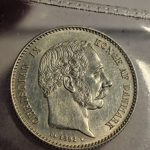 Dansk sølv 1 krone 1892 i top kvalitet og kraftige takker i randen.