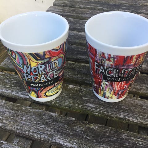 Fire aida termokopper med farverige striber og grafiske motiver af Hornsleth