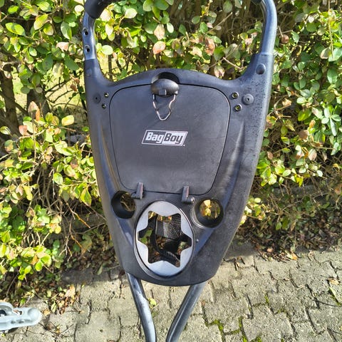 Bagboy Quad golfvogn med 4 store hjul og justerbart håndtag. Har holder til scorekort/drikke og kurv under til opbevaring af udstyr.