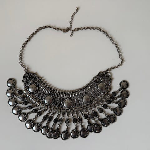 Stor halskæde, ALDO Ethnic Tribal Chunky, sølvbelagt med sten og sort stofbånd.