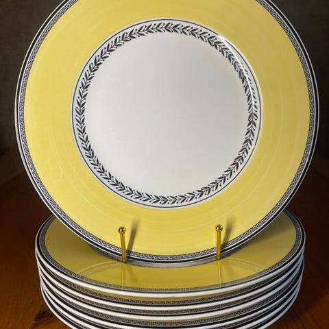 Flotte tallerkener fra Christineholm med dyb blå kant og guldmønster rundt i kanten. Sælges samlet, se billeder for mønster og form.