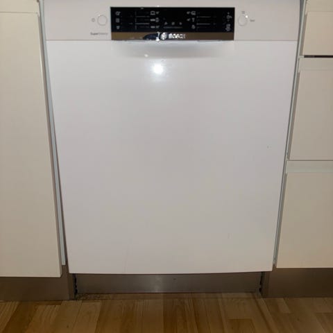 Lækker Bosch underbygget opvaskemaskine i rustfrit stål. Frontbetjent model med integreret betjeningspanel øverst på fronten. Maskinen har tre niveauer med øverste bestikbakke samt to kurve til tallerkener, glas og køkkenredskaber.