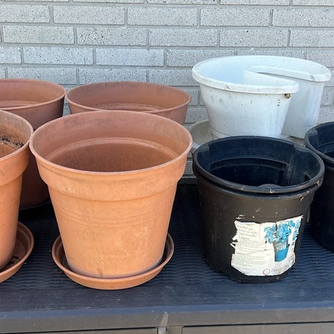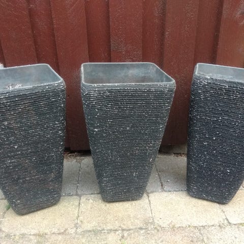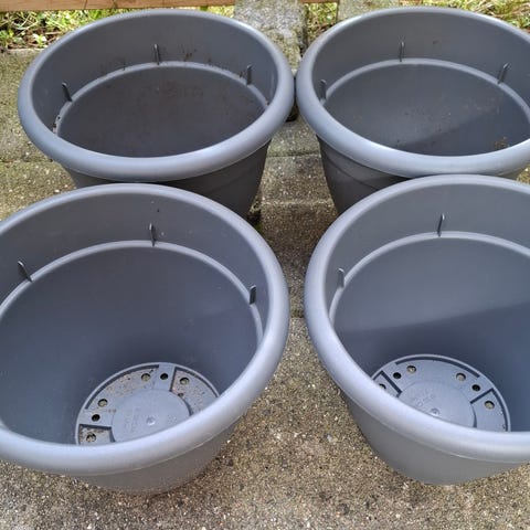 Store sorte plastpotter til planter, ca. 30 cm i diameter og højde. Med drænhuller i bunden.