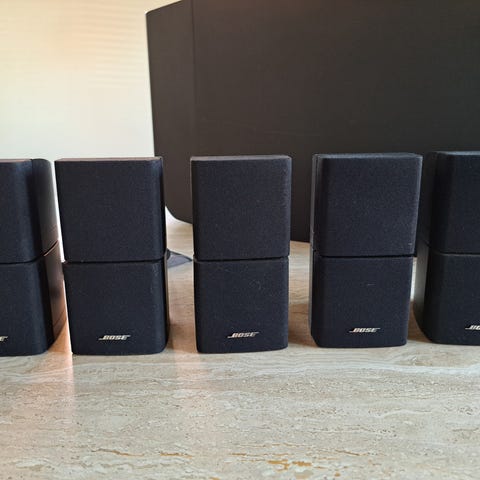 Højttalersæt med subwoofer og fem små satellithøjttalere. Der følger et bundt kabler med til tilslutning.