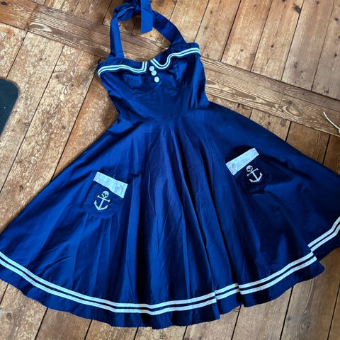 Kjolen er i S eller en str 38 og har V-udskæring og lange ærmer og bindesnor i taljen, så man kan lave den figursyet.