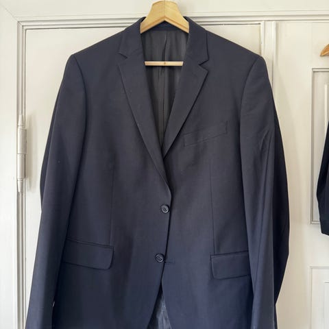 Mørke blå Tommy Hilfiger Jakkesæt i uld i str 52 med to knapper foran. Har lommer med klap, brystlomme og inderlommer. Blazer str.52 bukser 34/32