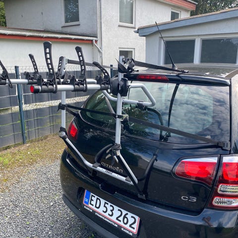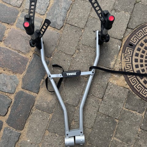 Thule cykelholder til montering på bagklap sælges. Har justerbare arme med gummistropper og remme til fastgørelse på bilen.