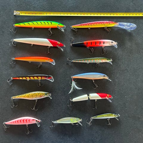 Syv Westin Platypus i forskellige størrelser og farver. Klassiske woblere inden for predatorfiskeri efter gedde og aborre.