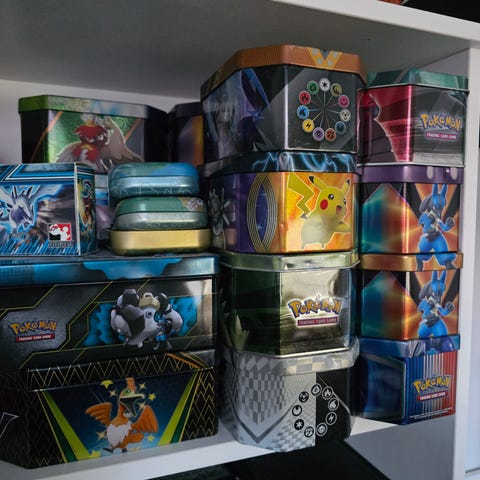 Sæt med Pokémon Hidden Fates Power Trio Tin bokse med forskellige motiver. Fede farverige æsker med vindue foran, gode til både samling og opbevaring af kort.