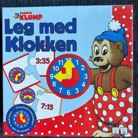 Rasmus Klump spillet 'Hvad er klokken?' med brikker med ure, tal og figurer. Sjov måde for børn at øve klokken på med enkle spilleregler.