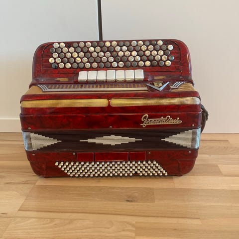 Rød concertina “sutherland” harmonika med håndstropper og knapper i begge sider. Har grøn bælg med mønster og metalbeslag, samt rød foret taske med lynlås og hank.