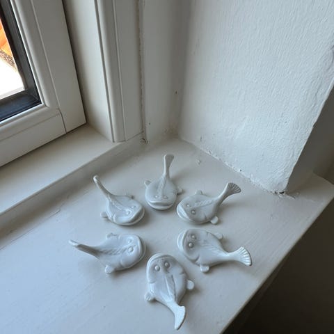 6 skønne fisk i hvid porcelæn- perfekt at hvile sushipinde på - eller bestik (knivstole).