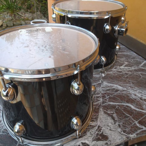 Sæt med to trommer, en rød og en hvid, med metalkanter. Begge har skind på toppen og kan stå på bord eller hylde.