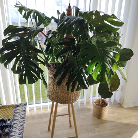 Fint fletkurv til plante i sort og beige mønster. Har håndtag i siderne og står stabilt på gulvet.