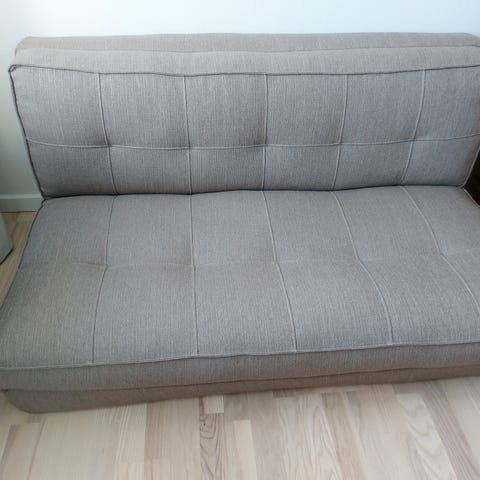 Sovesofa i beige velour, siden slås ned og vupti så har du en seng, fra ikke-ryger hjem, betræk kan lynes af og vaskes, står I Ballerup, men kan også afhentes i Hillerød efter aftale