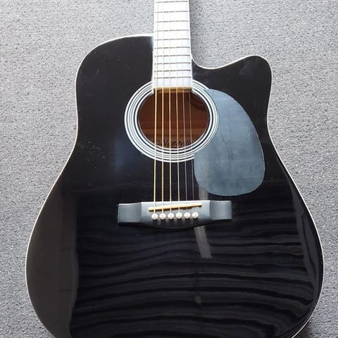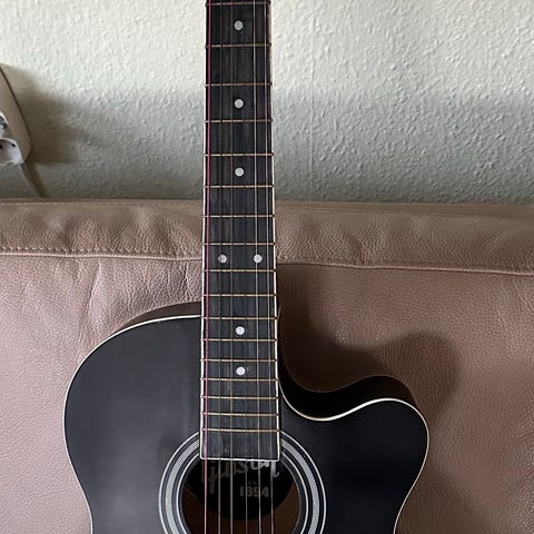 Sælger denne fine sorte akustiske guitar med indbygget pickup, så den kan tilsluttes forstærker. Perfekt til både begyndere og let øvede – eller bare til hygge derhjemme.