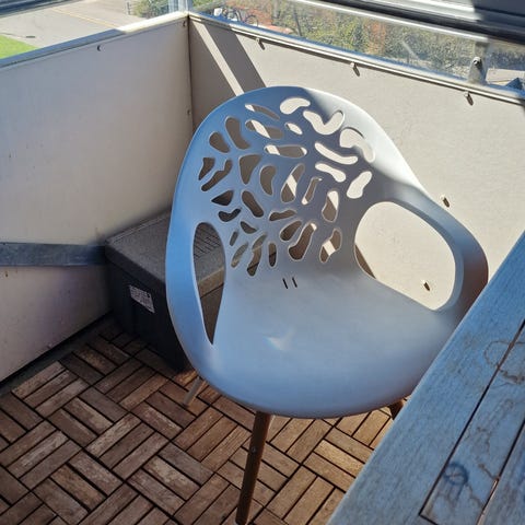 4 hvide metalstole med armlæn og runde rygge sælges samlet. Der ligger løse hynder på sæderne, som kan tages af eller skiftes efter behov. Alle 4 for 200 kroner