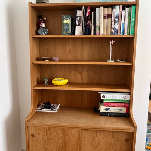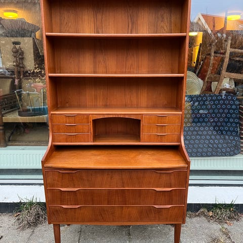 Teak reol (Bornholmer-reol) med tre flytbare hylder, udtræksplade samt tre skuffer. Ingen synlige skader eller slidspor.