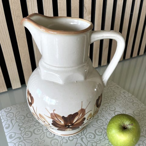 Fin Stavangerflint Daisy kande med margueritmotiv langs bunden. Højden er ca. 17 cm. God solid hank og hældetud, flot til bordet eller som dekoration. Uden skår og revner - men margeritten under tuden er lidt “slidt” - se billedet. Ellers en utrolig flot kande. Stellet er designet af Turi Gramstad Oliver.
