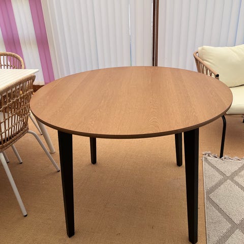 Lækkert bord i sort/valnød, med sorte glas detaljer på foden.