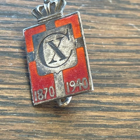 1870-1945. Har nålelukning bagpå og hængende skjold med krone og motiv foran.
