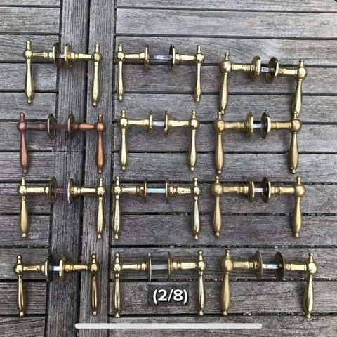 Ældre dørgreb med træhåndtag og sorte metalrosetter. Fin til dig der mangler et gammelt greb til en dør eller et projekt.