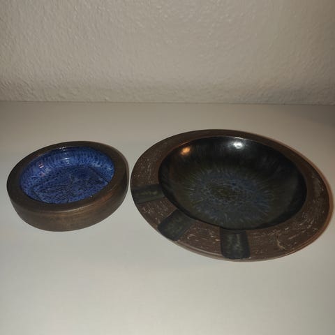 To små brune keramik skåle. Fejler ikke noget, har stået lidt til pynt ellers bare inde i skabet. Den en står der J.L under.