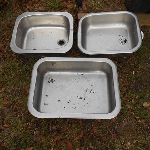 Dobbelt køkkenvask i rustfrit stål med to kummer og runde afløb. Der er vist mål på billederne med tommestok, så du kan se størrelsen på vasken.