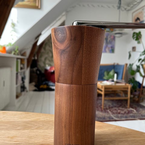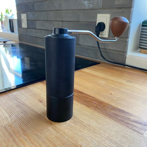 Hario manuel kaffekværn i sort med håndsving. Har justerbar kværn og gennemsigtig beholder med målemarkeringer.