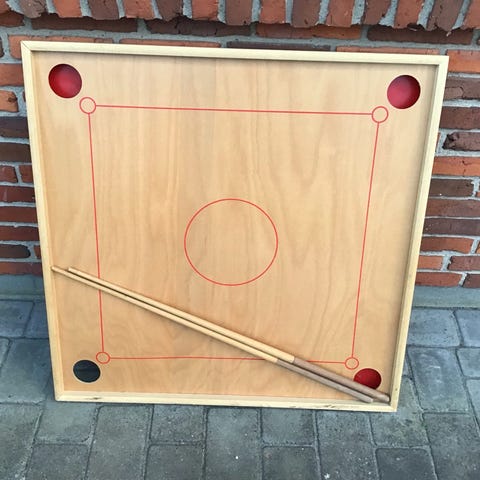 Lille billardbord med grøn filt og træramme. Der følger et par køer med og hullerne er i kanterne af bordet. 110x60 cm.