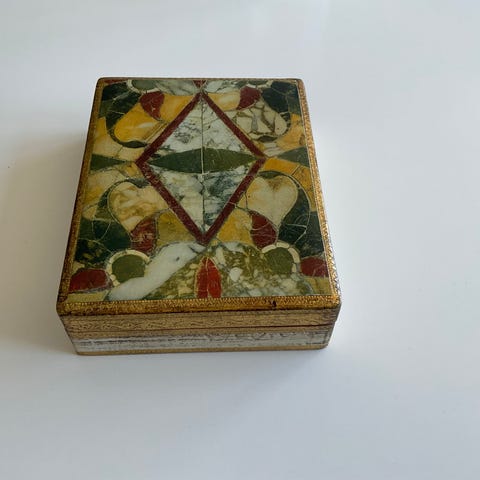 Fantastisk flot ældre skrin håndlavet i Italien. Uden skår og slag. Måler 7 5 x 11,5 x 6,5 cm.