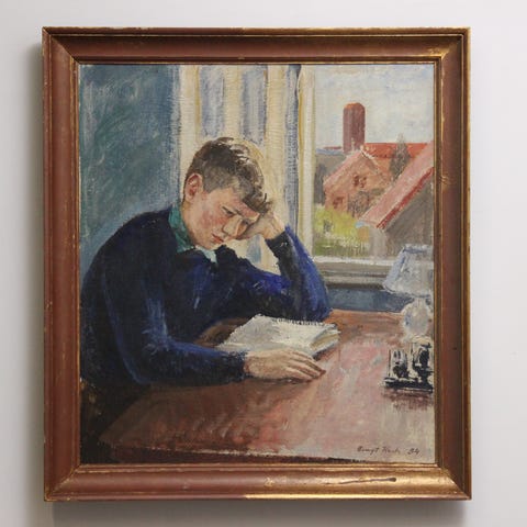 Et klassisk eksempel på dansk mid-century figurativt maleri med fokus på det stille, intime øjeblik.
