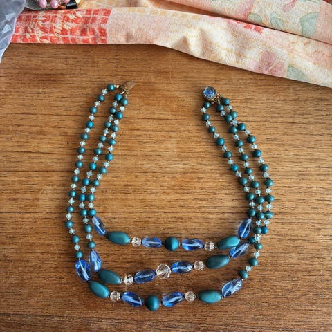 Den sorte halskæde er blodsten, den blå halskæde er krystal, men jeg kan ikke huske navnet, de grønne ørenringe er malakit.