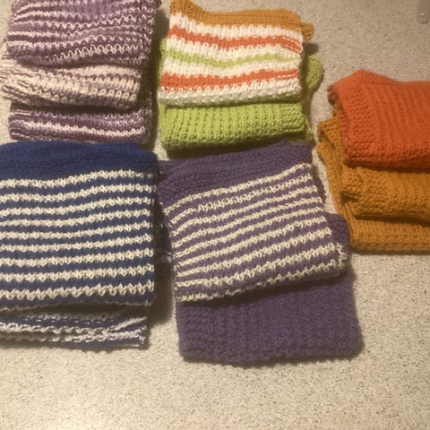 12 STK. HJEMMESTRIK KARKLUDE STRIKET I MULTIFARVET GARN + MØRKERØD OG ORANGE FARVER. ALLE 100% BOMULDSGARN. - MÅL: CA. 25 X 26 CM. - VED FORSENDELSE MED DAO OG FIKS OG FÆRDIG ELLER PÅ DEN GAMMELDAGS MÅDE.